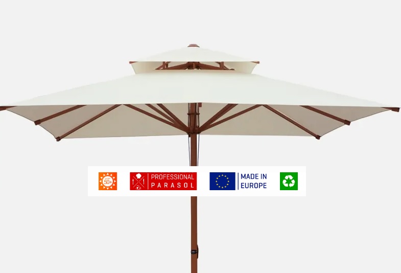 NATUR gostinski senčnik prinaša brezčasno eleganco in naravno toplino v vaš zunanji prostor. S prefinjenim lesenim ogrodjem, ki v kombinaciji z visokokakovostnimi materiali ustvarja stilsko vzdušje, je ta senčnik idealna izbira za restavracije, kavarne in hotele, ki cenijo naravni dizajn.